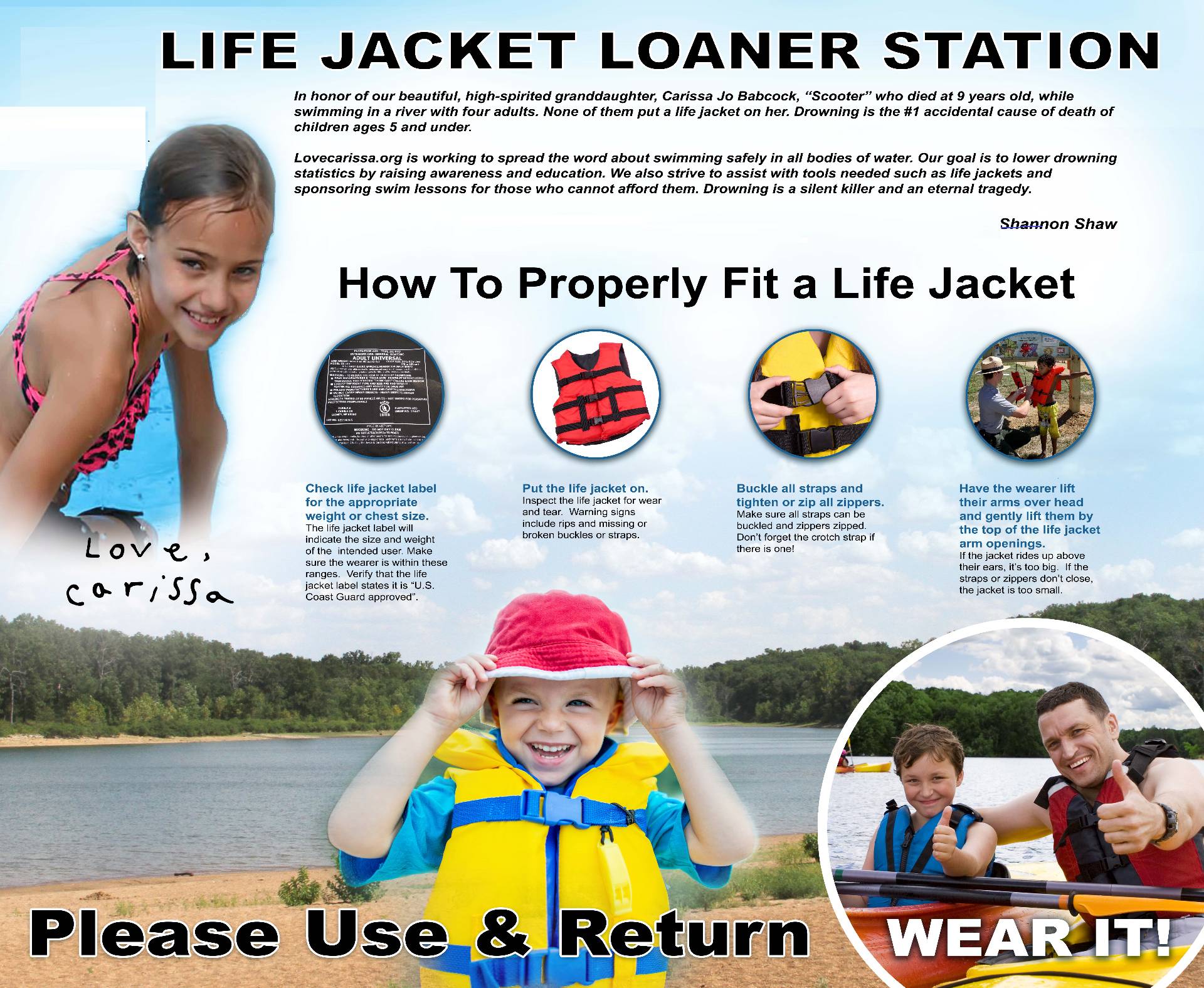 In honor of our beautiful, high-spirited granddaughter, Carissa Jo Babcock, “Scooter” who died at 9 years old, while swimming in a river with four adults. None of them put a life jacket on her. Her death and all drownings are 100% preventable! Drowning is the #1 accidental cause of death of children ages 5 and under.